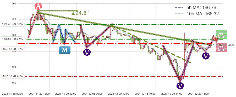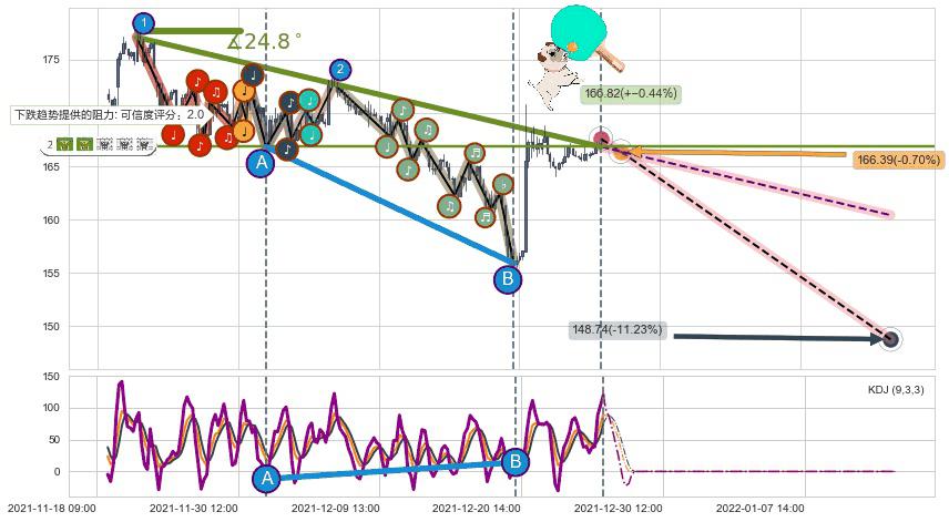 ➢ 预测:2021-12-28 14:00,【试探阻力】稳定目前下跌趋势的前提下,预测价格:166.39