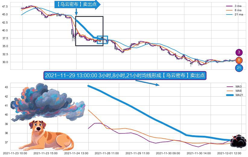 形态多维评估: ⚀ 2021-11-24 13:00:00小时-2021-12-01 11:00:00小时显现 3小时-8小时-21小时均线 【乌云密布】卖出点 看空信号,后市看跌,卖出