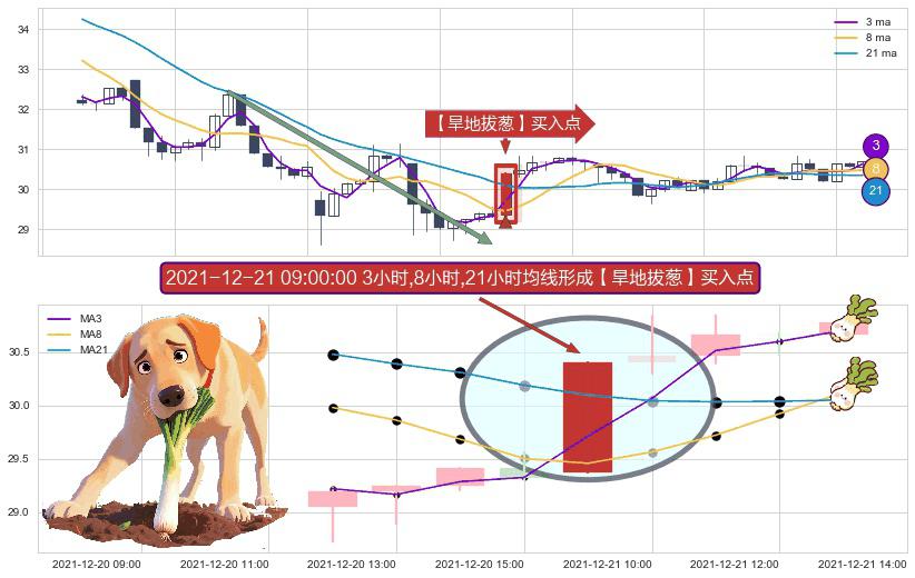 形态多维评估: ⚀ 2021-12-21 09:00:00小时显现 3小时-8小时-21小时均线 【旱地拔葱】买入点 看多信号,后市看涨,买入