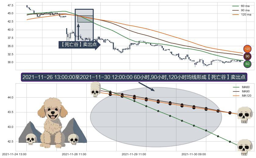 形态多维评估: ⚀ 2021-11-29 09:00:00-小时至2021-11-30 12:00:00-小时显现 60小时-90小时-120小时均线 【死亡谷】卖出点 看空信号,后市看跌,卖出