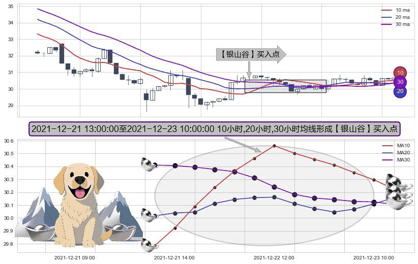 形态多维评估: ⚀ 2021-12-21 14:00:00-小时至2021-12-23 10:00:00-小时显现 10小时-20小时-30小时均线 【银山谷】买入点 看多信号,后市看涨,买入