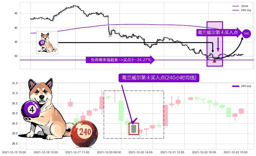 形态多维评估: ⚀ 2021-12-20 11:00:00-小时显现 葛兰威尔均线 240小时均线 第④买入点 下降趋势均值回复的短线反弹信号,后市看涨,买进信号