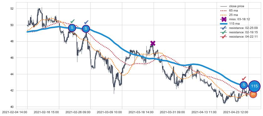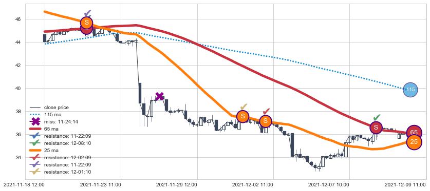 下跌趋势02-04 14:00-04-23 14:00,均线115确认关键阻力3处