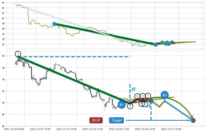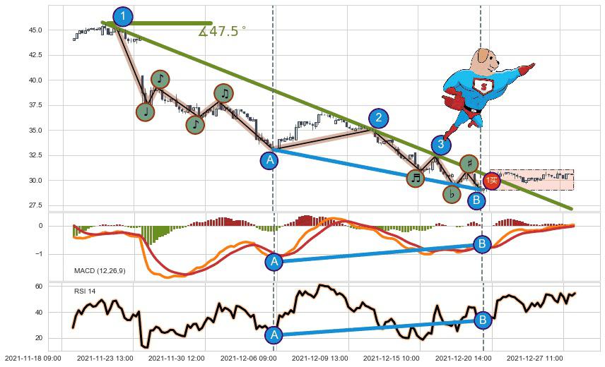 从2021-11-22 09:00至2021-12-21 12:00,共包含142个小时,阶段股价下跌-36.96%,阶段股价变动位移路程比: 1 : 3,下跌趋势角度: 47.5,2021-11-24 09:00向↘︎形成缺口,跳空下跌-12.49%˚