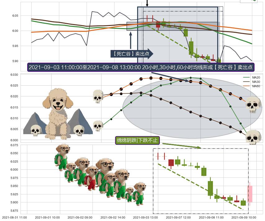 | 4 🅚:【死亡谷】卖出点 ➕ 📈:趋势线上涨趋势原支撑已出现破位,猜想原支撑已变为阻力位(大周期均值回复) ☞ 看空信号 ⇥ 【均线】交织【图形】⇥ 综合量化分数: 39 | > |