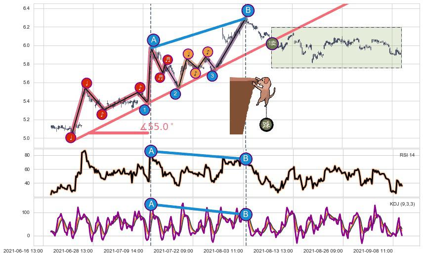 ➢ 上升趋势【顶点B】比【顶点A】高⤴️,【KDJ】指标【顶点B】比【顶点A】低⤵️