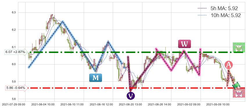 ♘ 阻力价格位6.07,可信任强度94.56%,距离最后交易2021-09-09 14:00形成的收盘价格5.90相差 +2.87%