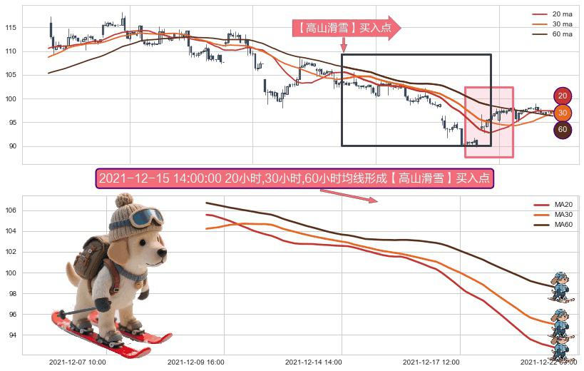 ⚀ 2021-12-09 13:00:00小时-2021-12-21 12:00:00小时显现 20小时-30小时-60小时均线 【高山滑雪】买入点 看多信号,后市看涨,买入