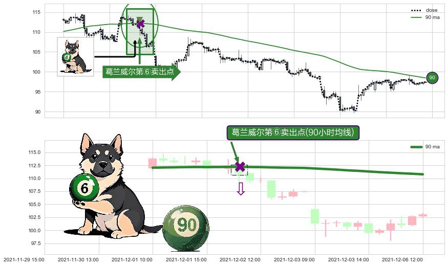 ⚀ 2021-12-02 10:00:00-小时显现 葛兰威尔均线 90小时均线 第⑥卖出点 走势反转见顶信号,后市看跌,卖出信号