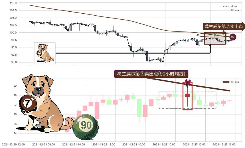 ⚀ 2021-12-27 09:00:00-小时显现 葛兰威尔均线 90小时均线 第⑦卖出点 下降趋势的中继信号,后市看跌,卖出信号