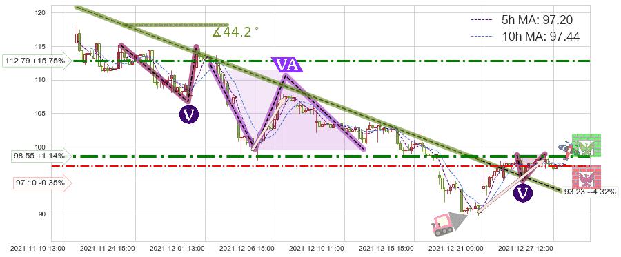 ♘ 阻力价格位98.55,可信任强度74.83%,距离最后交易2021-12-27 16:00形成的收盘价格97.44相差 +1.14%