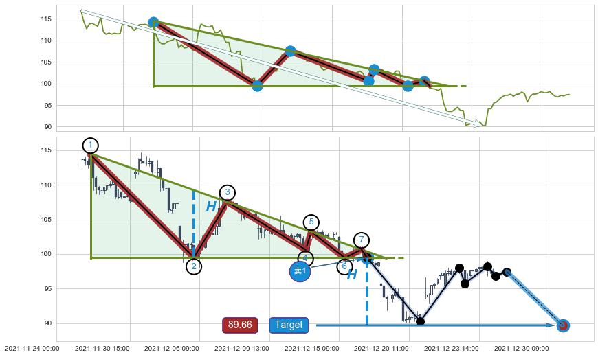 ➢ 最后的下跌趋势2021-11-22 09:00至2021-12-20 16:00:存在突破迹象,后续小反弹或者反转上涨