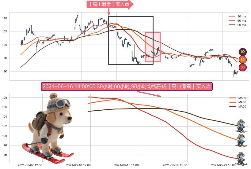 ⚀ 2021-06-10 11:00:00小时-2021-06-23 11:00:00小时显现 30小时-60小时-90小时均线 【高山滑雪】买入点 看多信号,后市看涨,买入
