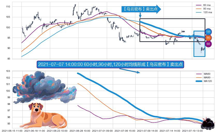 ⚀ 2021-06-24 12:00:00小时-2021-07-19 15:00:00小时显现 60小时-90小时-120小时均线 【乌云密布】卖出点 看空信号,后市看跌,卖出