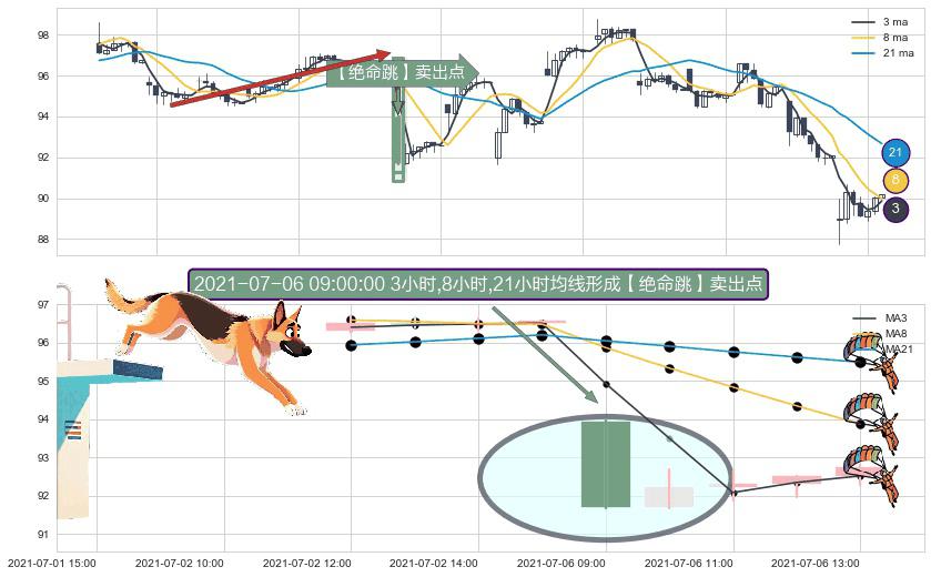 ⚀ 2021-07-06 09:00:00小时显现 3小时-8小时-21小时均线 【绝命跳】卖出点 看空信号,后市看跌,卖出