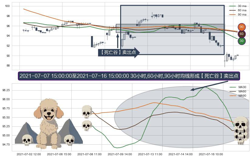 ⚀ 2021-07-08 09:00:00-小时至2021-07-16 15:00:00-小时显现 30小时-60小时-90小时均线 【死亡谷】卖出点 看空信号,后市看跌,卖出