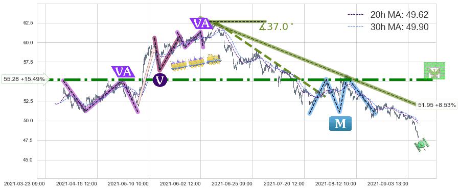 从2021-06-02 11:00至2021-09-09 14:00,共包含421个小时,阶段股价下跌-23.67%,阶段股价变动位移路程比: 1 : 7,下跌趋势角度: 37.0