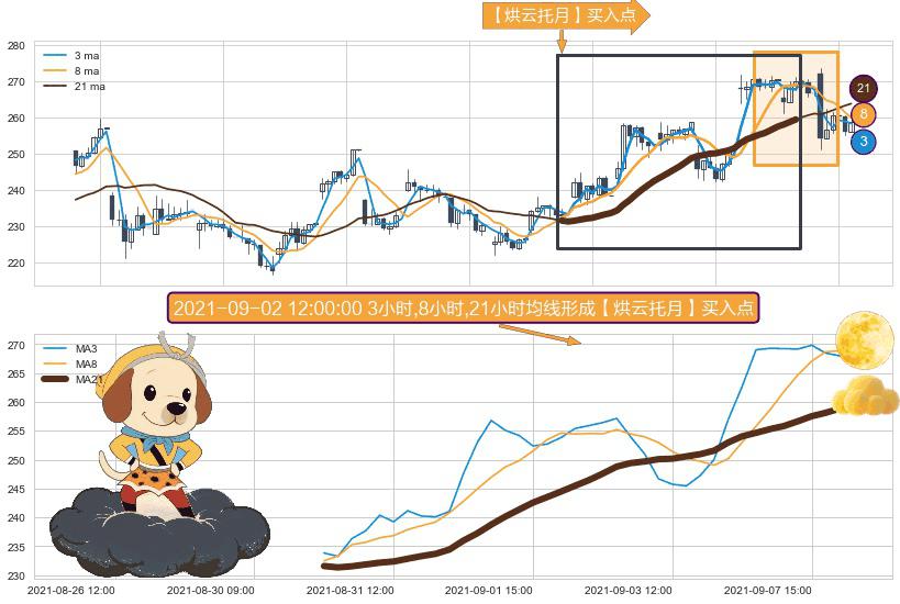 ⚀ 2021-08-30 14:00:00小时-2021-09-08 11:00:00小时显现 3小时-8小时-21小时均线 【烘云托月】买入点 看多信号,后市看涨,买入