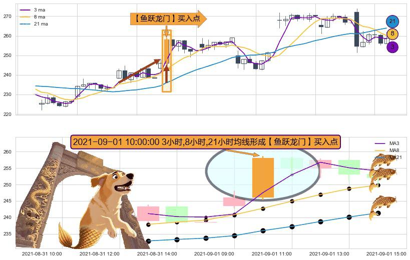⚀ 2021-09-01 10:00:00小时显现 3小时-8小时-21小时均线 【鱼跃龙门】买入点 看多信号,后市看涨,买入