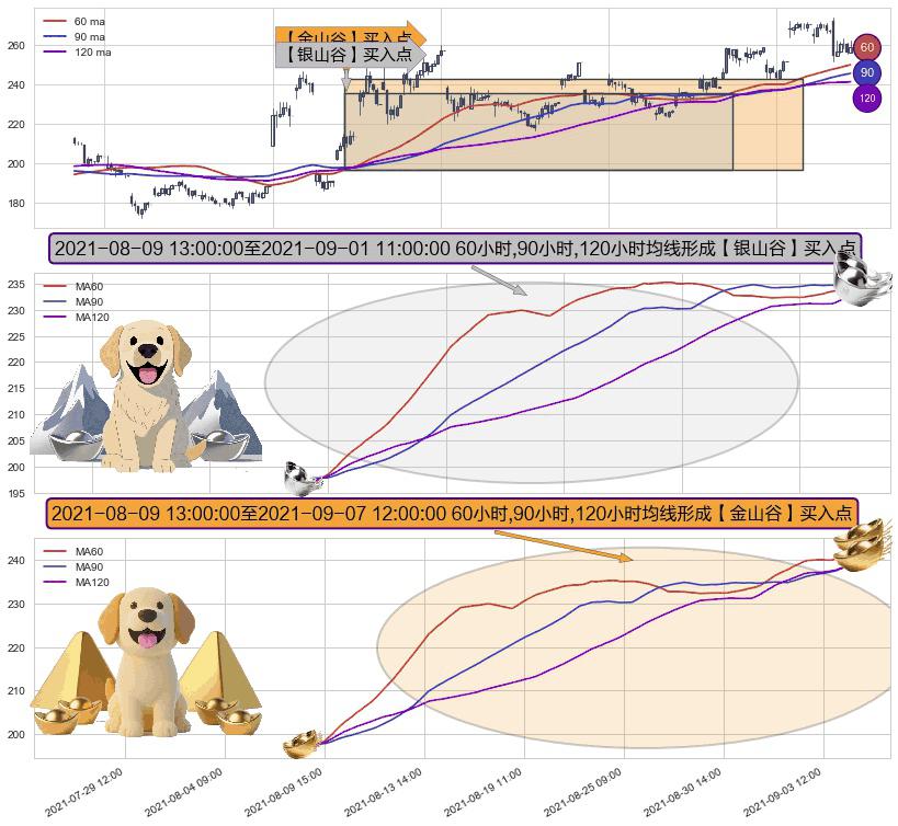 ⚀ 2021-08-09 14:00:00-小时至2021-09-07 12:00:00-小时显现 60小时-90小时-120小时均线 【金山谷】买入点 其再次确认了买入信号,可靠性更强,买入