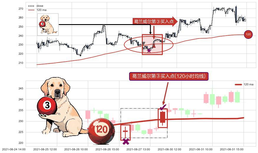 ⚀ 2021-08-30 09:00:00-小时显现 葛兰威尔均线 120小时均线 第③买入点 上升趋势的中继信号,后市看涨,买进信号