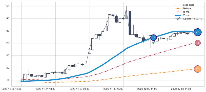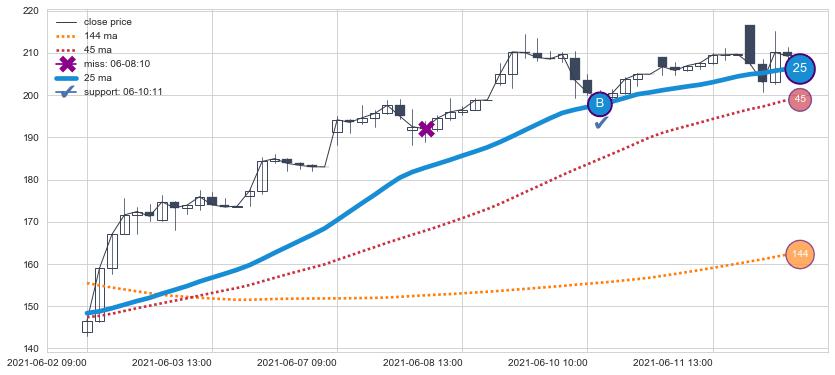 ⚁ MA3和MA8走势平行,且始终保持在短距离内,MA21始终在短中期均线下方,与短中期均线保持一定的距离,微微上行