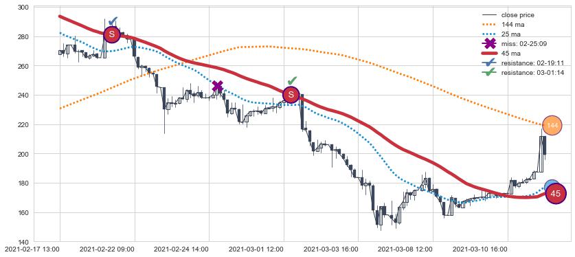 ➢ 最优均线组合共正确确认支撑阻力信号9处,正确确认率 64.29%
