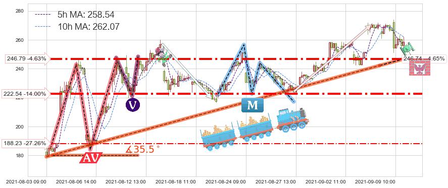 从2021-08-03 09:00至2021-09-07 15:00,共包含168个小时,阶段股价上涨48.28%,阶段股价变动位移路程比: 1 : 5,上涨趋势角度: 35.5,2021-08-04 09:00向⇪形成缺口,跳空上涨+19.05%