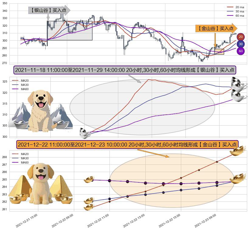 ⚃ 2021-12-22 12:00:00-小时至2021-12-23 10:00:00-小时显现 20小时-30小时-60小时均线 【金山谷】买入点 其再次确认了买入信号,可靠性更强,买入