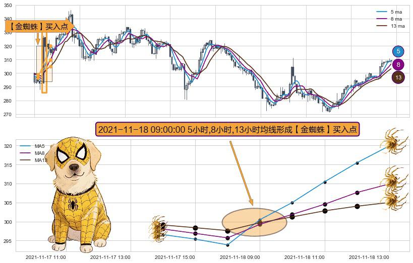 ⚀ 2021-11-18 09:00:00小时显现 5小时-8小时-13小时均线 【金蜘蛛】买入点 看多信号,后市看涨,买入