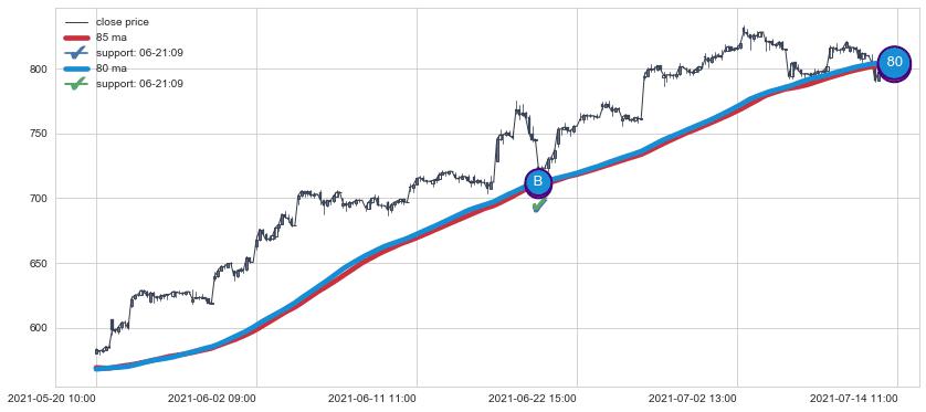 ➢ 最优均线组合共正确确认支撑阻力信号3处,正确确认率 75.00%