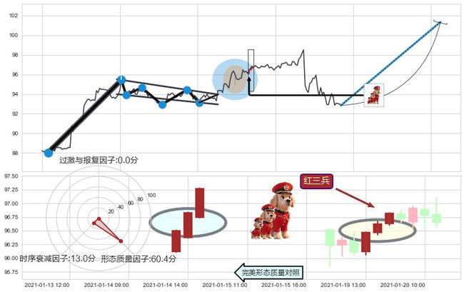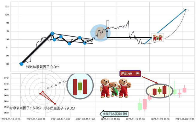 ➢ 🕰 价格走势在2021-01-19 15:00:00至2021-01-20 09:00:00期间形成两红夹一黑,残存影响值:1.68
