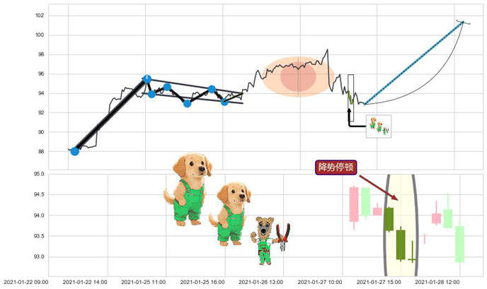 ➢ 🕰 价格走势在2021-01-27 14:00:00至2021-01-27 16:00:00期间形成降势停顿,残存影响值:9.06