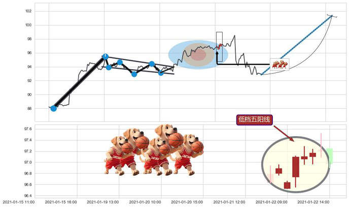 ➢ 🕰 价格走势在2021-01-21 16:00:00至2021-01-22 12:00:00期间形成低档五阳线,残存影响值:1.07