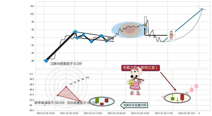 ➢ 🕰 价格走势在2021-01-25 11:00:00至2021-01-25 13:00:00期间形成早晨之星(黎明之星),残存影响值:3.24
