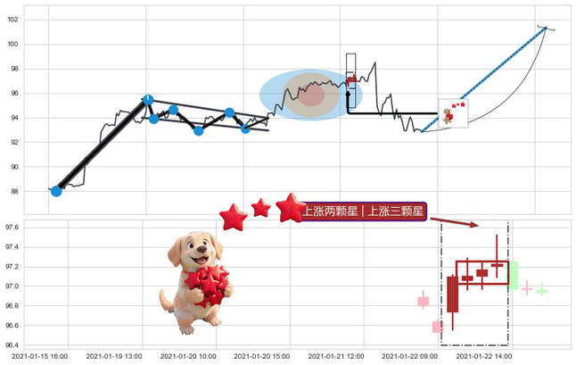➢ 🕰 价格走势在2021-01-22 10:00:00至2021-01-22 13:00:00期间形成上涨两颗星 | 上涨三颗星,残存影响值:1.53