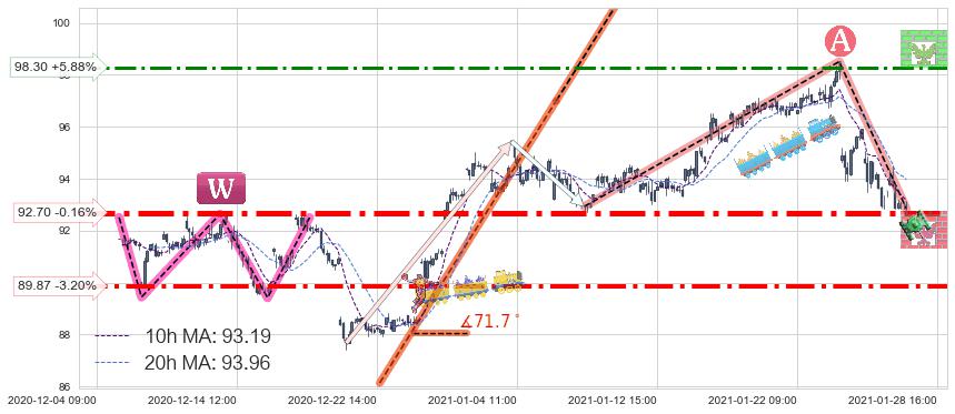 ♘ 阻力价格位98.30,可信任强度56.60%,距离最后交易2021-01-28 16:00形成的收盘价格92.84相差 +5.88%