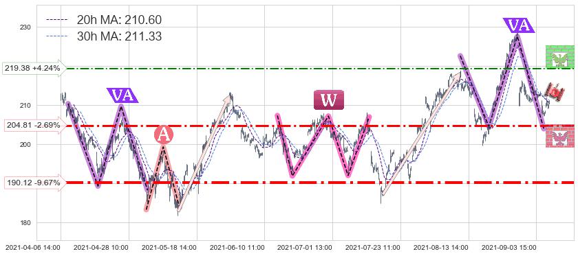 ♘ 阻力价格位219.38,可信任强度52.51%,距离最后交易2021-09-09 14:00形成的收盘价格210.46相差 +4.24%