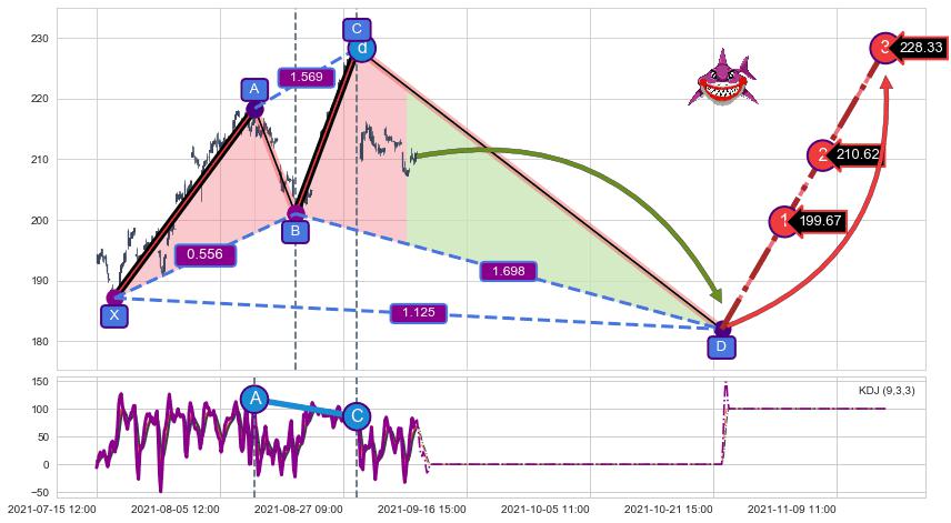 ➢ 距离预测D点位置有足够的下跌空间, 与看涨【鲨鱼】形态相反,实际方向【看跌】