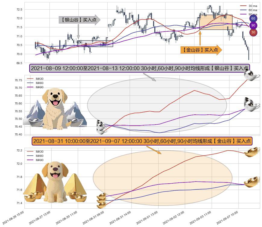 ⚃ 2021-08-31 11:00:00-小时至2021-09-07 12:00:00-小时显现 30小时-60小时-90小时均线 【金山谷】买入点 其再次确认了买入信号,可靠性更强,买入