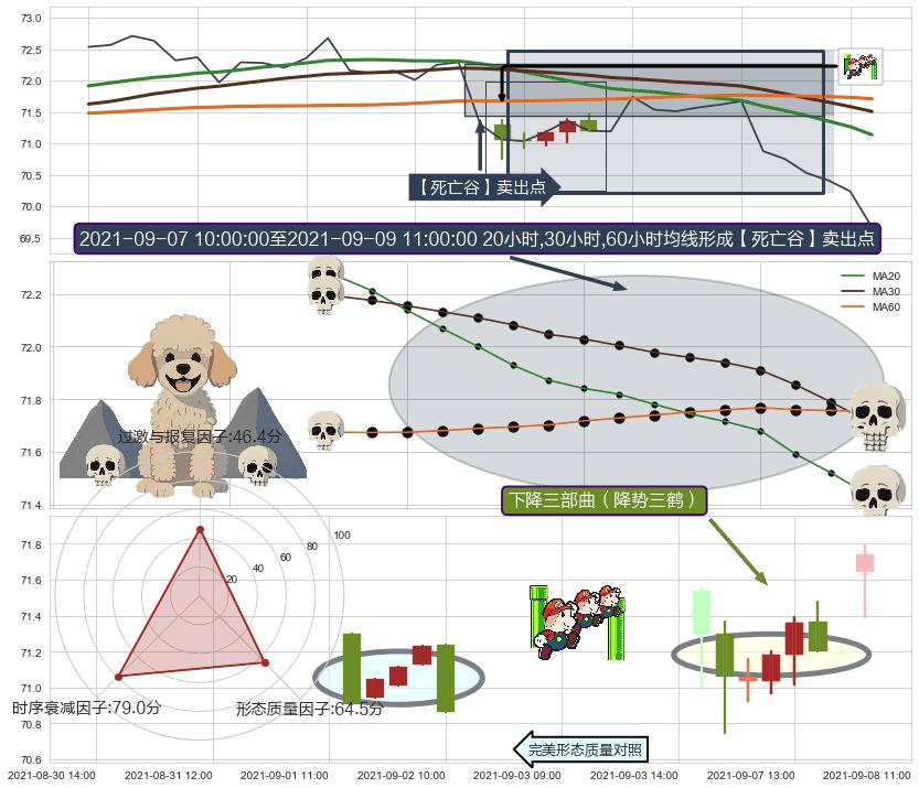 | 2 🅚:三只乌鸦 ➕ 🎢:【死亡谷】卖出点均线组合卖出点信号形成后,猜想后续破位下跌,沿着向下的尖头三角下跌 ☞ 看空信号 ⇥ 【均线】交织【🅚线】⇥ 综合量化分数: 39 | > |