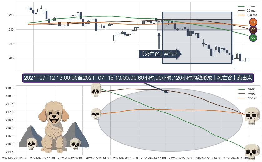 形态多维评估: ⚀ 2021-07-12 14:00:00-小时至2021-07-16 13:00:00-小时显现 60小时-90小时-120小时均线 【死亡谷】卖出点 看空信号,后市看跌,卖出