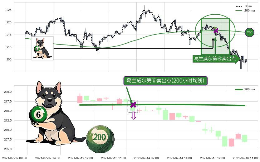 形态多维评估: ⚀ 2021-07-13 12:00:00-小时显现 葛兰威尔均线 200小时均线 第⑥卖出点 走势反转见顶信号,后市看跌,卖出信号