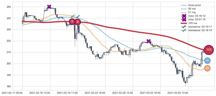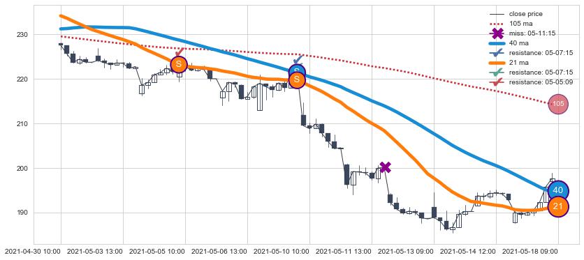 下跌趋势04-30 10:00-05-18 09:00,均线40, 21确认关键阻力2处