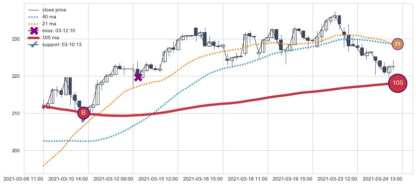 上涨趋势03-09 11:00-03-24 13:00,均线105确认关键支撑1处