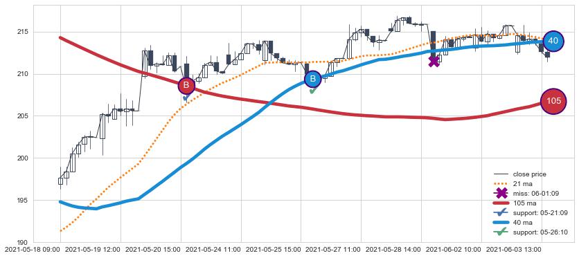 上涨趋势05-18 09:00-06-03 14:00,均线40, 105确认关键支撑2处