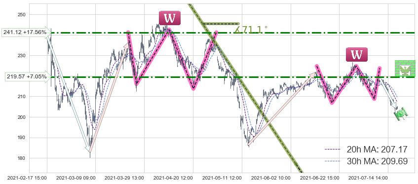 ♘ 阻力价格位241.12,可信任强度68.76%,距离最后交易2021-07-19 14:00形成的收盘价格205.11相差 +17.56%