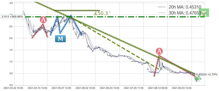 🦴 长线均值回复组合短线趋势跟踪[强阻力信号]2021-03-22 10:00-2021-09-09 14:00下跌趋势依然成立(下跌趋势跟踪依然存在),短线价格略微上行反弹(均值回复猜想),即将接近下跌趋势提供的未破位阻力价格:0.45023。