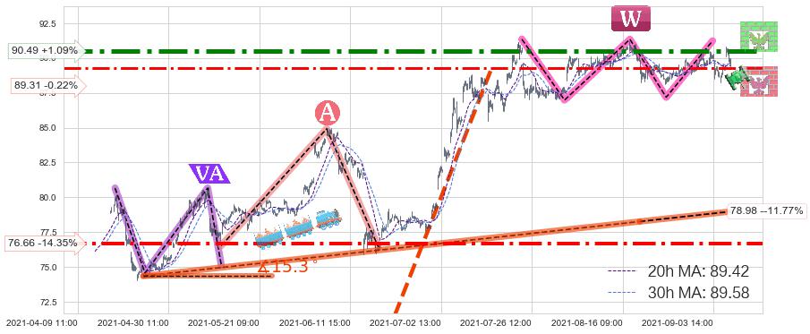 ♘ 阻力价格位90.49,可信任强度93.91%,距离最后交易2021-09-09 14:00形成的收盘价格89.51相差 +1.09%