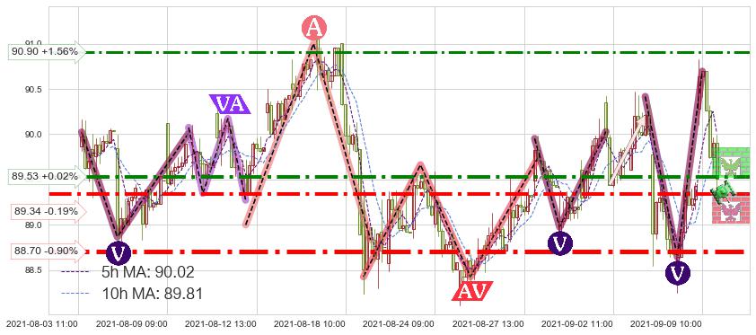 ♘ 阻力价格位90.90,可信任强度55.14%,距离最后交易2021-09-09 14:00形成的收盘价格89.51相差 +1.56%